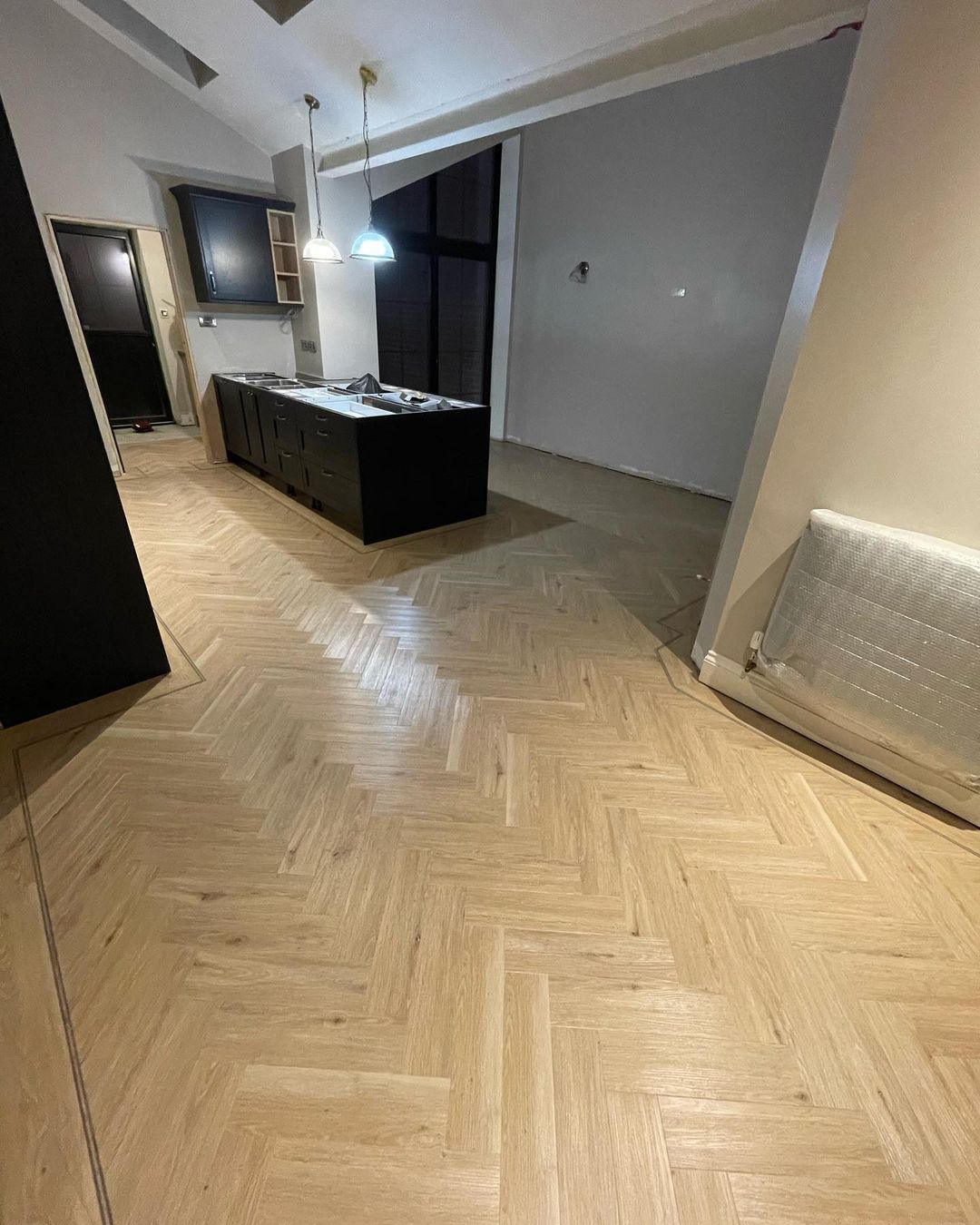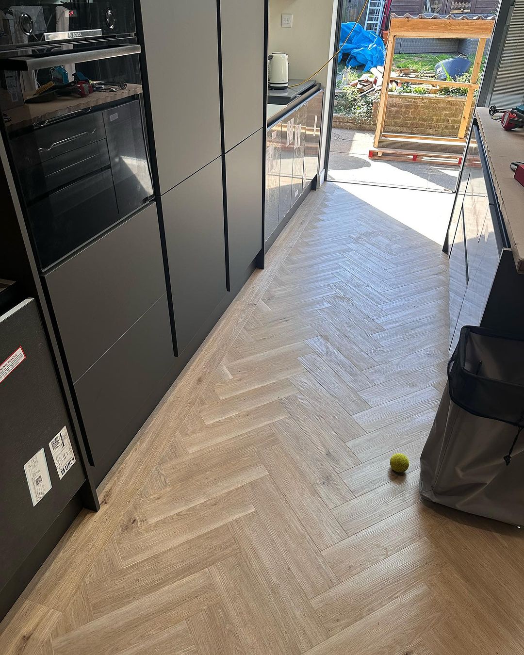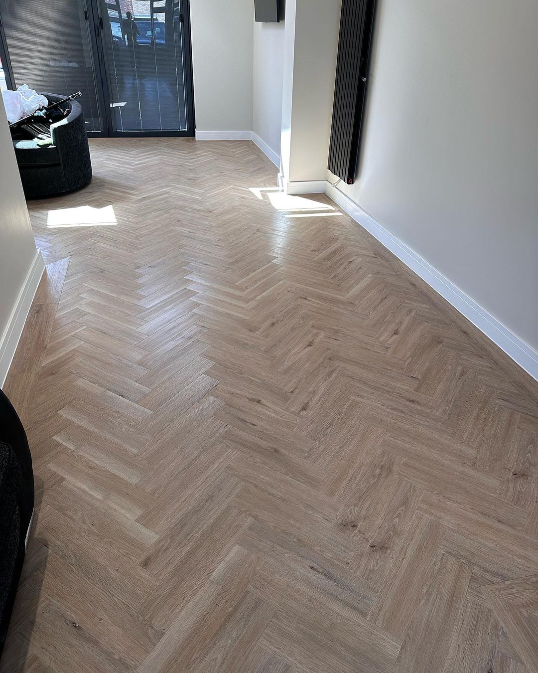 How’s this for a great job by Warwickshire Flooring Ltd? A home renovation featuring a new extension, kitchen and lounge featuring our Washed Oak Herringbone LVT.
